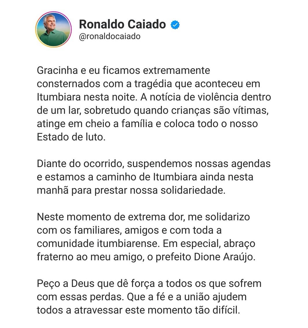 “@gracinhacaiado e eu ficamos extremamente consternados com a tragédia que aconteceu em Itumbiara nesta noite. A notícia de violência dentro de um lar, sobretudo quando crianças são vítimas, atinge em cheio a família e coloca todo o nosso Estado de luto.