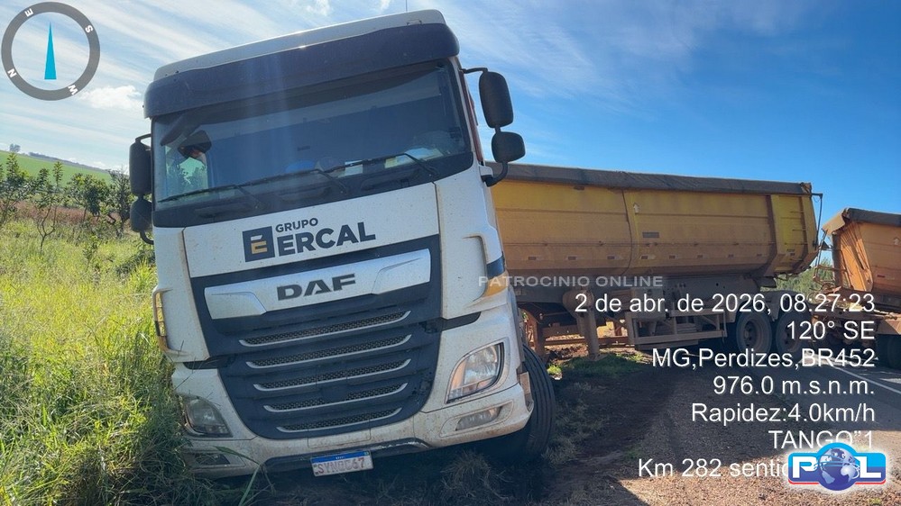 A Polícia Militar Rodoviária foi acionada pela CCO da empresa EPR, concessionária administrativa da rodovia MGC-452, km 282 no município Perdizes, na manhã desta quinta-feira, 2/4, por volta das 10h40min, devido a um erro de manobra que deixou uma composição veicular de carga atolada na faixa de domínio do DER, bloqueando totalmente o trânsito.