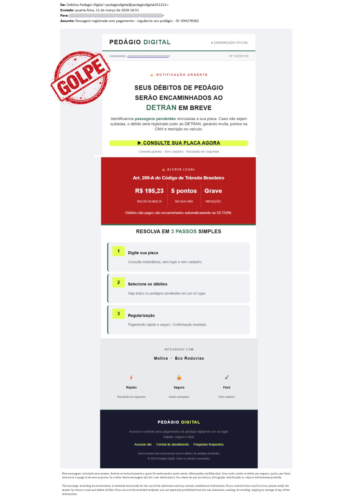 A Triunfo Concebra informa que não possui os dados pessoais dos motoristas que transitam nas praças de pedágio sob sua concessão. A orientação aos usuários que receberem uma mensagem suspeita de cobrança de pedágio é se certificar da origem, antes de seguir instruções que possam induzir a golpes pela internet, bloqueando o remetente, quando for o caso.