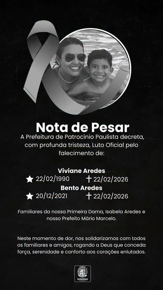 Em nota oficial, a Prefeitura de Patrocínio Paulista decretou luto oficial pelo falecimento de Viviane Aredes (22/02/1990 – 22/02/2026) e Bento Aredes (20/12/2021 – 22/02/2026), familiares da primeira-dama Isabela Aredes e do prefeito Mário Marcelo. O município manifestou solidariedade aos familiares e amigos, desejando força e conforto neste momento de dor.