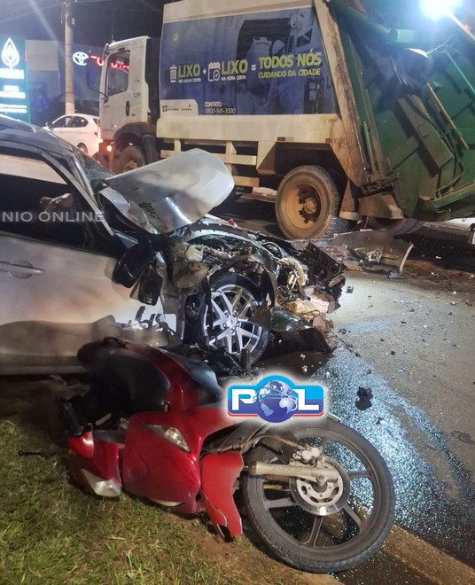 Os Bombeiros informaram que, compareceram à Avenida JK para atendimento de ocorrência de acidente de trânsito envolvendo os três veículos, sendo um automóvel Ford Fusion, uma motocicleta Honda Biz e um caminhão de coleta de lixo.