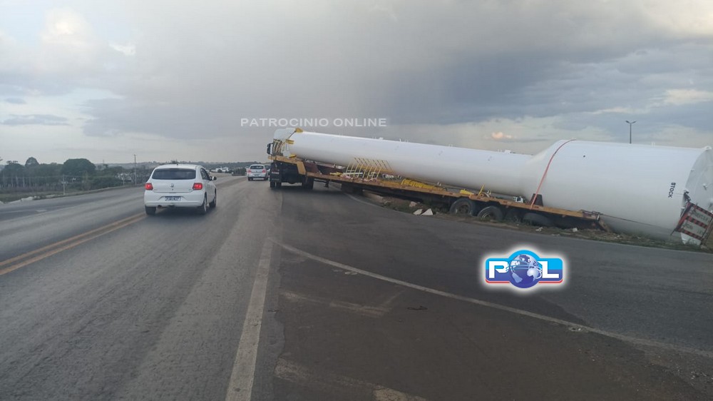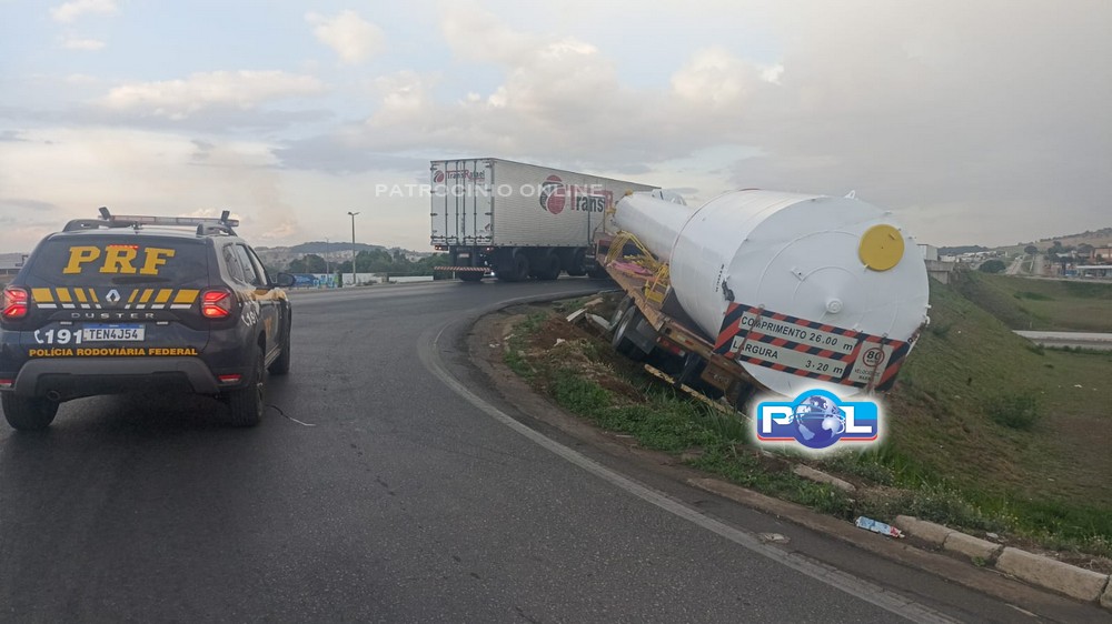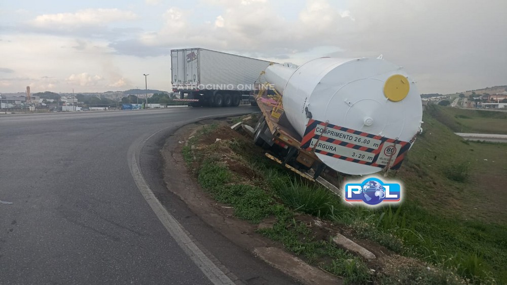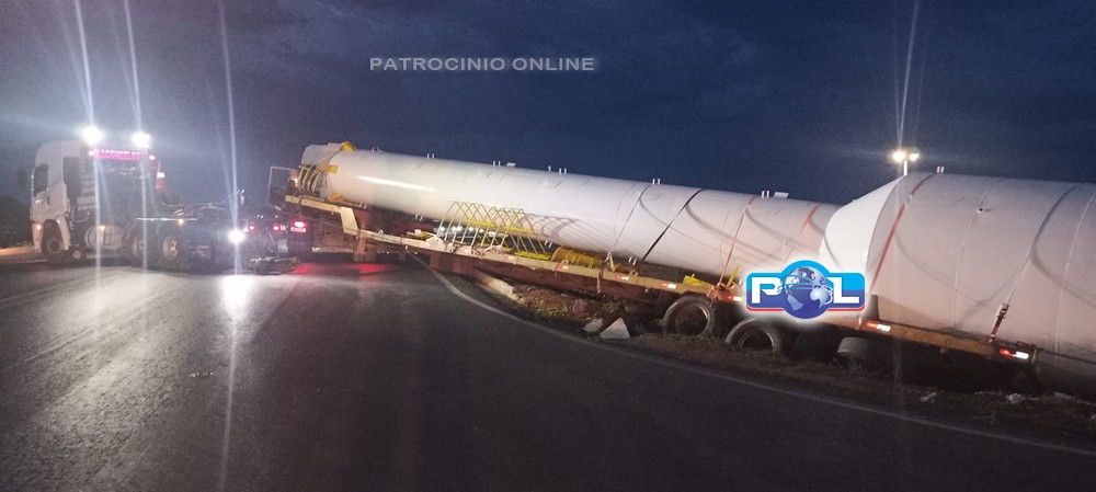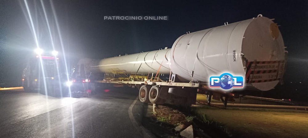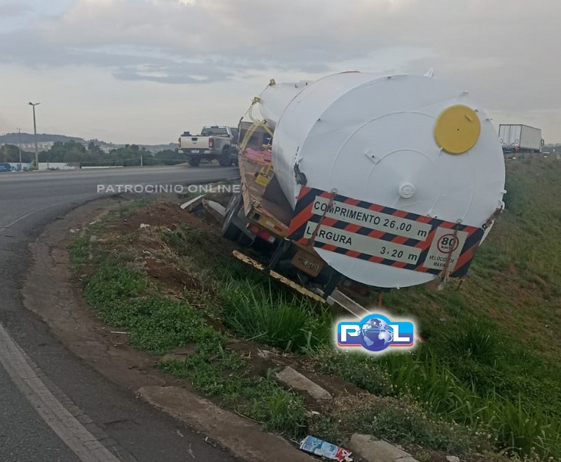 A PRF atendeu na noite de quinta-feira, 16/10, um acidente envolvendo uma carreta que transportava uma caixa d’água de grandes proporções acabou saindo da pista ao tentar fazer a alça do viaduto na BR 365 no Trevo da Pipoca, em Patos de Minas. O motorista não conseguiu completar a manobra e o veículo ficou preso no canteiro, quase tombando.
