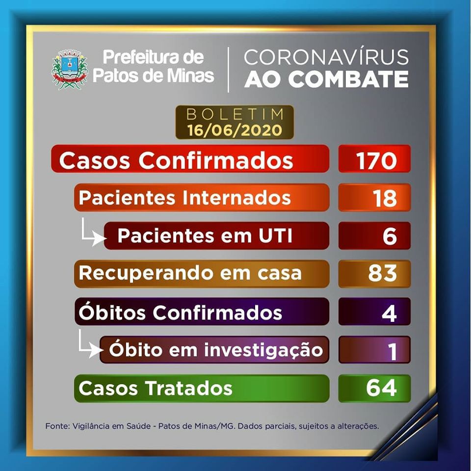 A Prefeitura de Patos de Minas informa os números do coronavírus em 16/6/2020: