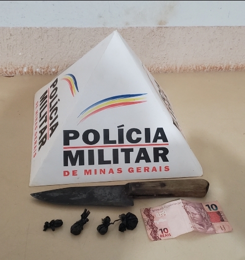 A PM apreendeu 04 invólucros de cocaína, dinheiro e 01 faca e 10 reais.