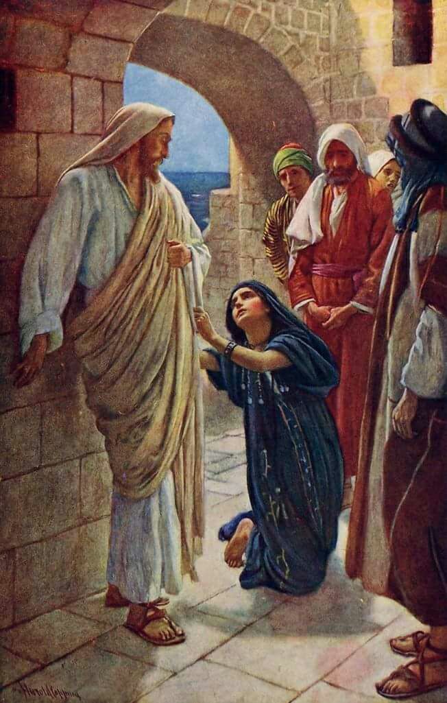 Em seguida, deixando aquele lugar, foi para a terra de Tiro e de Sidônia. E tendo entrado numa casa, não quis que ninguém o soubesse. Mas não pôde ficar oculto, pois uma mulher, cuja filha possuía um espírito imundo, logo que soube que ele estava ali, entrou e caiu a seus pés. [...] Ora, ela suplicava-lhe que expelisse de sua filha o demônio. Disse-lhe Jesus: "Deixa primeiro que se fartem os filhos, porque não fica bem tomar o pão dos filhos e lançá-lo aos cães”. Mas ela respondeu: "É verdade, Senhor; mas também os cachorrinhos debaixo da mesa comem das migalhas dos filhos”. Jesus respondeu-lhe: "Por causa desta palavra, vai-te, que saiu o demônio de tua filha”. [...]