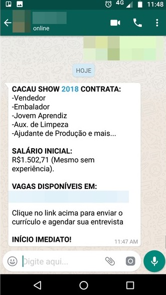 Um novo golpe no WhatsApp usa o nome da marca de chocolates Cacau Show para oferecer vagas de emprego. O problema é que as supostas oportunidades são falsas e, segundo informações do DFNDR Lab, laboratório da PSafe especializado em segurança digital, 1 milhão de pessoas já clicaram no link malicioso em apenas 24 horas.