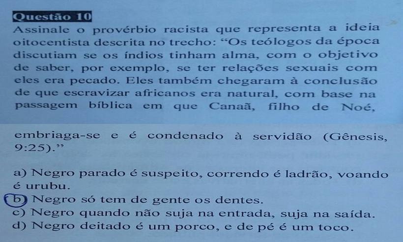 Na prova de conhecimentos gerais, foi apresentada uma pergunta “Qual a origem do racismo?”. Na sequência, foi transcrita a passagem bíblica (Gênesis 9:25) em que estaria subentendida a origem do preconceito racial contra o negro. No trecho, Canaã, filho de Noé, se embriaga e é condenado a servir como escravo. O candidato foi então orientado, a assinalar a alternativa que conteria o provérbio racista presente na publicação. Entre as opções de respostas: a) “negro parado é suspeito, correndo é ladrão, voando é urubu”; b) "negro só tem de gente os dentes", c) “negro quando não suja na entrada, suja na saída”; d) “negro deitado é um porco, e de pé um toco”. A alternativa correta para a questão seria o provérbio “negro só tem de gente os dentes”.