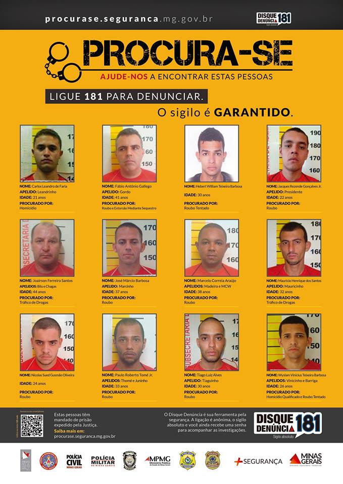 Cartazes também serão espalhados pelos municípios mineiros com as fotos dos procurados em locais de grande circulação de pessoas ou que foram reconhecidos como estratégicos pelas polícias. Todos possuem QR Code para acesso à lista de todos os procurados e outros detalhamentos por meio de Smartfones.