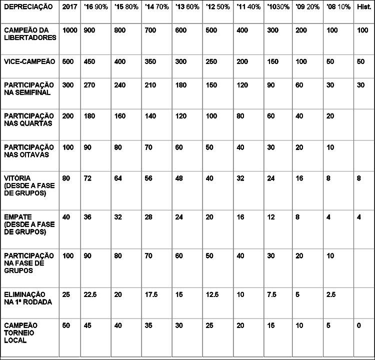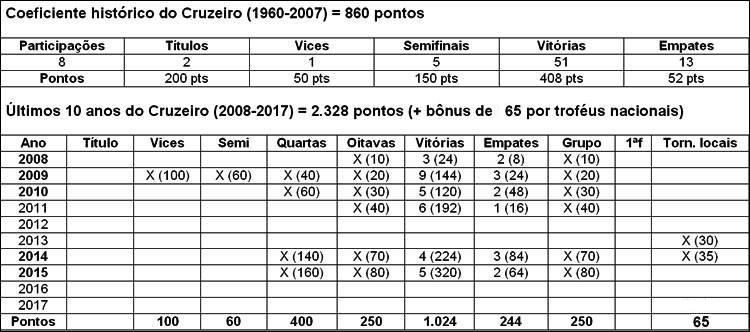 O Cruzeiro perdeu pontos no ranking da Copa Libertadores porque não participou da competição em 2017. A Conmebol considera, com pesos distintos, os resultados obtidos nos últimos 10 anos (2008-2017) e o coeficiente histórico desde a primeira edição do torneio (1960-2007), além de creditar bônus às agremiações que conquistam troféus nacionais em seus respectivos países.A Raposa, portanto, contabilizará no próximo ano 2.328 pontos pelas participações em Libertadores, 860 pelo histórico e 65 de bônus referentes aos títulos do Campeonato Brasileiro (2013 e 2014). Vale ressaltar que a Copa do Brasil não entra neste cálculo.