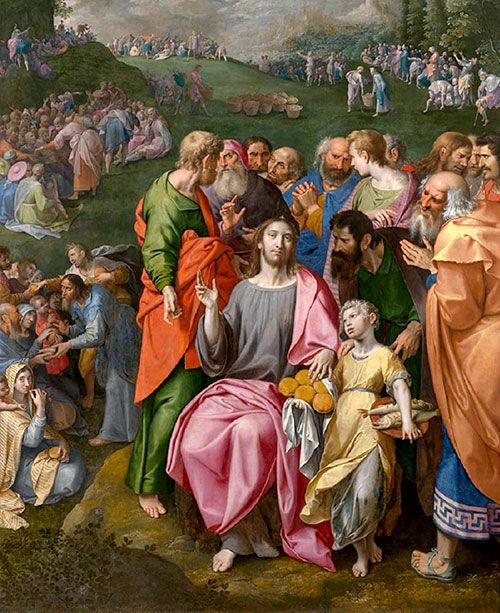 Jesus, porém, reuniu os seus discípulos e disse-lhes: "Tenho piedade desta multidão: eis que há três dias está perto de mim e não tem nada para comer. Não quero despedi-la em jejum, para que não desfaleça no caminho”. Disseram-lhe os discípulos: "De que maneira procuraremos neste lugar deserto pão bastante para saciar tal multidão?”. Pergunta-lhes Jesus: "Quantos pães tendes?”. "Sete, e alguns peixinhos” – responderam eles. Mandou, então, a multidão assentar-se no chão, tomou os sete pães e os peixes e abençoou-os. Depois os partiu e os deu aos discípulos, que os distribuíram à multidão. Todos comeram e ficaram saciados, e, dos pedaços que restaram, encheram sete cestos.