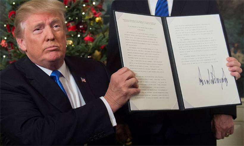 Ele também ordenou o início do processo de traslado da embaixada americana de Tel Aviv a Israel e reivindicou "um novo enfoque" para o conflito israelense-palestino.
