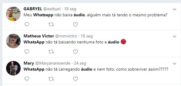 Em uma rápida busca no Twitter, é fácil encontrar usuários reclamando sobre as falhas na rede do WhatsApp; havendo também vários reports no Down Detector. Vale dizer que este problema pode ser visto nas versões para todos os sistemas operacionais portáteis, app para Windows e também no WhatsApp Web (carregado em navegadores).
