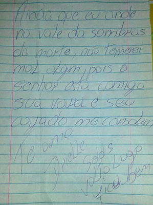 A cunhada de Drielle disse que ela chegou a enviar para casa uma sacola com roupas muito sujas e um bilhete para a mãe com os dizeres bíblicos "ainda que andasse pelo vale da sombra da morte, não temerei mau algum, porque o senhor está comigo, a tua vara e o teu cajado me consolam". E finalizou o bilhete dizendo "estou bem, volto logo, saudades fica bem, beijos".