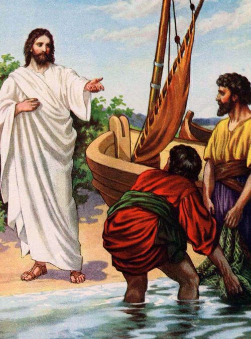 Caminhando ao longo do mar da Galileia, viu dois irmãos: Simão (chamado Pedro) e André, seu irmão, que lançavam a rede ao mar, pois eram pescadores. E disse-lhes: "Vinde após mim e vos farei pescadores de homens”. Na mesma hora, abandonaram suas redes e o seguiram. Passando adiante, viu outros dois irmãos: Tiago, filho de Zebedeu, e seu irmão João, que estavam com seu pai Zebedeu consertando as redes. Chamou-os, e eles abandonaram a barca e seu pai e o seguiram.