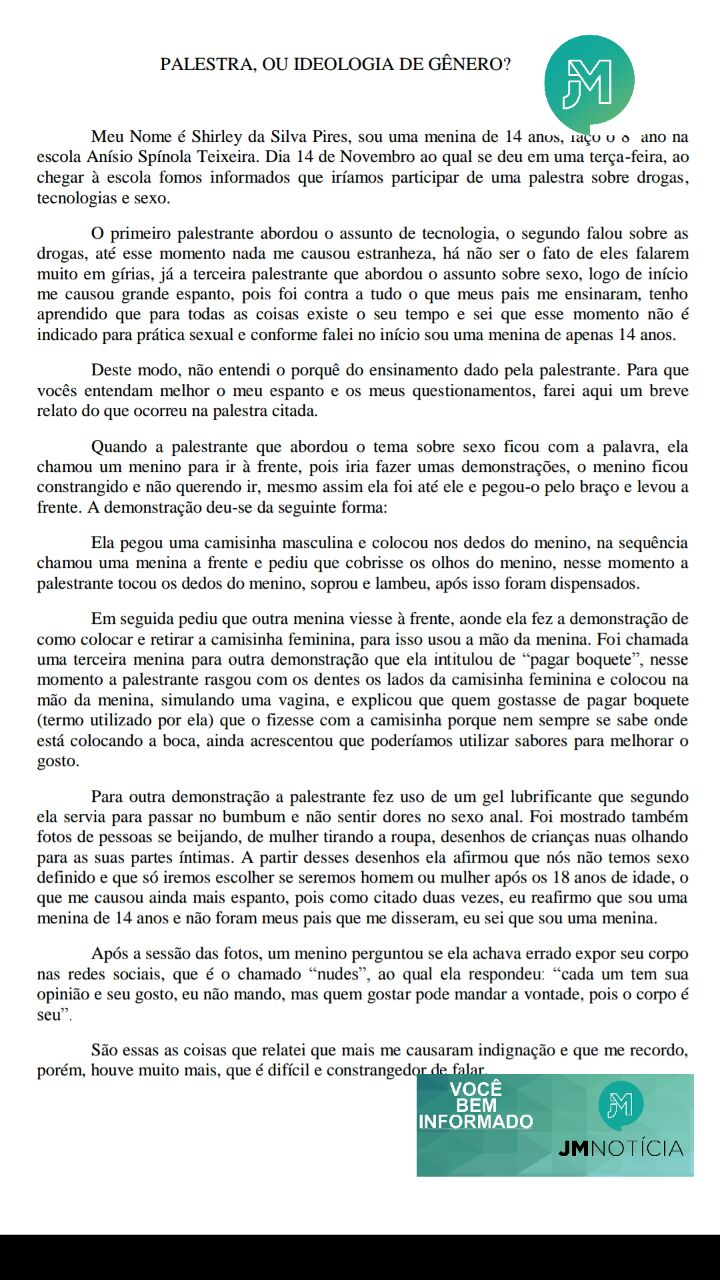 A jovem ainda falou que durante a palestra foi ensinado a eles sobre ideologia de gênero, tema rejeitado em dezembro de 2015 pela Câmara Municipal daquela cidade, mas que a gestão atual tem tentado incluir no currículo escolar.