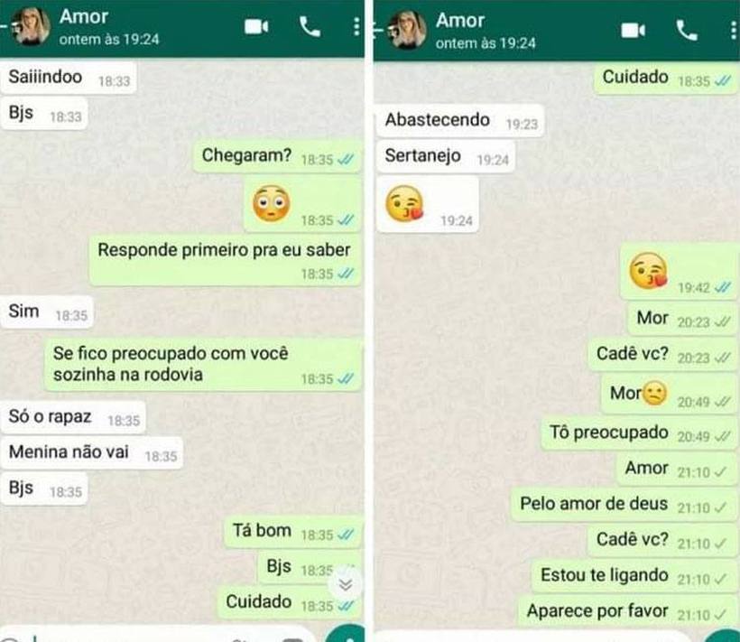 Pelo aplicativo, Kelly informou seu namorado que viajaria apenas com o homem: "Só o rapaz, a menina não vai, bjs", escreveu. Ele respondeu: "Cuidado!" Ela voltou a fazer contato para dizer que estava abastecendo no posto Sertanejo, na BR-153. Depois, ele já não recebeu retorno e se desesperou: "Mor, cadê você? Tô preocupado. Pelo amor de Deus!"
