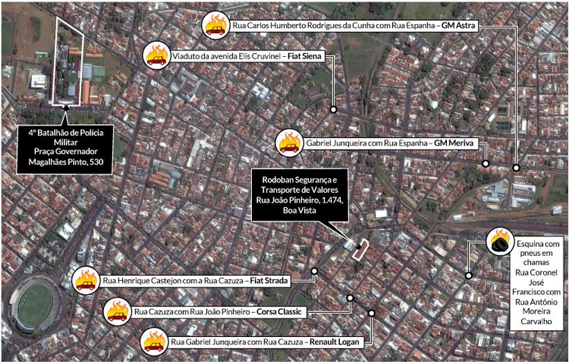 O coronel Lupércio Peres, que comanda a 5ª Região de Polícia Militar e ocupa na ocorrência o cargo local mais alto da PM, disse que os criminosos montaram uma contenção extremamente sofisticada nas ruas de acesso ao endereço da transportadora Rodoban, que fica no Bairro Boa Vista (veja arte). Enquanto tentavam romper pelo menos um cofre da empresa usando maçarico e explosivos, deixaram seis carros incendiados bloqueando vias e outros tipos de barricada.
