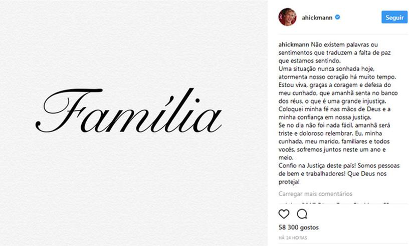 Na tarde passada, Ana desabafou sobre o caso em um post no Instagram. “Estou viva, graças a coragem e defesa do meu cunhado, que amanhã senta no banco dos réus, o que é uma grande injustiça. Coloquei minha fé nas mãos de Deus e a minha confiança em nossa justiça”, escreveu.