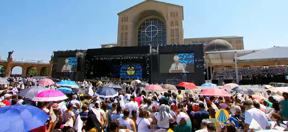 “Diante dele nos encontramos agora em oração (…) Neste Santuário Mariano sente-se pulsar o coração católico do Brasil. O amor e a devoção à Virgem Maria fazem parte da cultura latino-americana e são um elemento característico da religiosidade do povo brasileiro. É uma devoção profundamente enraizada nas almas, transmitida de geração em geração”, enfatizou.