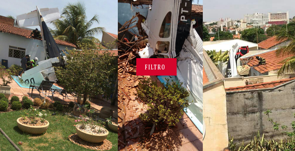 As imagens mostram que o bico do avião se chocou no quintal da residência. Parte da asa ficou dentro da piscina.