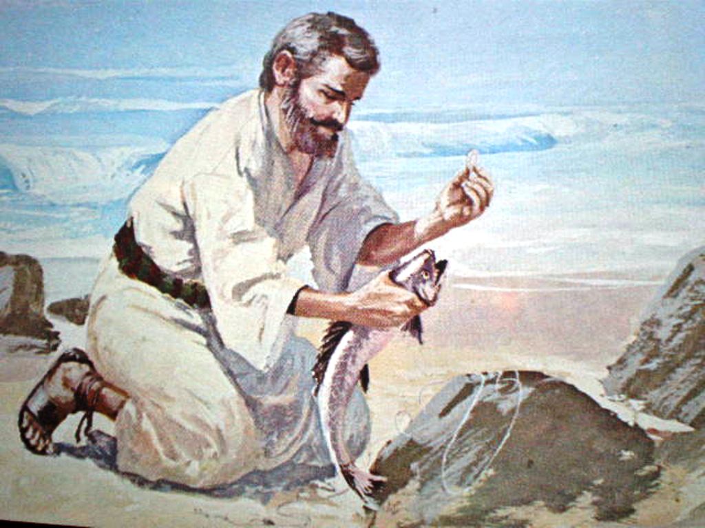 Logo que chegaram a Cafarnaum, aqueles que cobravam o imposto da didracma aproximaram-se de Pedro e lhe perguntaram: "Teu mestre não paga a didracma?”. – "Paga, sim” – respondeu Pedro. Mas quando chegaram à casa, Jesus preveniu-o, dizendo: "Que te parece, Simão? Os reis da terra, de quem recebem os tributos ou os impostos? De seus filhos ou dos estrangeiros?”. Pedro respondeu: "Dos estrangeiros”. Jesus replicou: "Os filhos, então, estão isentos. Mas não convém escandalizá-los. Vai ao mar, lança o anzol, e ao primeiro peixe que pegares, abrirás a boca e encontrarás um estater. Toma-o e dá-o por mim e por ti”.