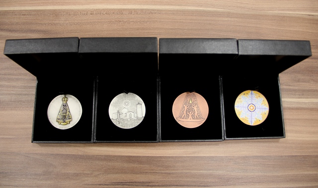 O ineditismo não está presente apenas nas cores, mas também na realização de um conjunto de medalhas. “Trata-se de um projeto inédito, um conjunto de medalhas para o mesmo motivo, à altura da homenagem que se quer prestar. Certamente não por acaso, tinham que ser justamente medalhas para homenagear a Virgem Maria.”, destaca o gerente da Seção de Comercialização de Medalhas e Moedas Comemorativas da casa da Moeda, José Victor Martins.