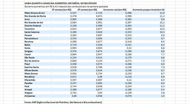 Os motoristas que abasteceram com gasolina seus veículos na semana após o anuncio do reajuste dos combustíveis pagaram R$ 0,2850 a mais por cada litro do combustível. As informações foram reveladas na noite desta sexta-feira (28), pela ANP (Agência Nacional do Petróleo, Gás Natural e Biocombustíveis).