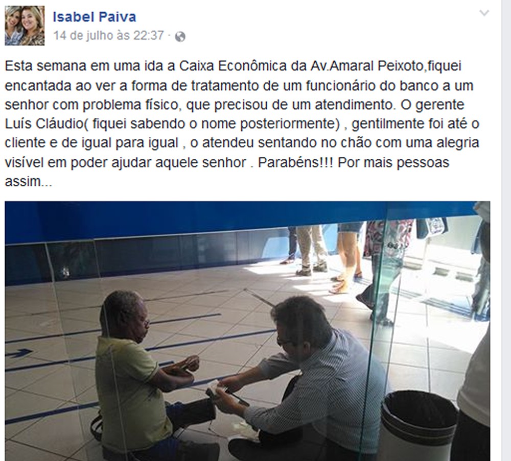 "Não tinha o hábito de ir a aquela agência, fui por acaso naquele dia. Vi o senhor portador de deficiência, a princípio sem ser notado, aguardando a vez. De repente surgiu o gerente e o atendeu dessa maneira, sentando no chão, olhando nos olhos. Achei interessante a prontidão dele, a boa vontade. Que esse gesto sirva de exemplo", disse.
