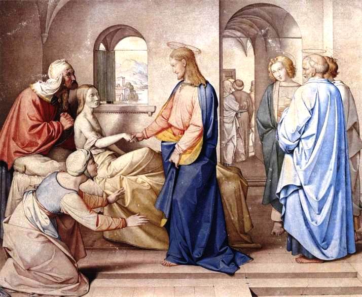 Apresentou um chefe da sinagoga. Prostrou-se diante dele e lhe disse: "Senhor, minha filha acaba de morrer. Mas vem, impõe-lhe as mãos e ela viverá”. Jesus levantou-se e o foi seguindo com seus discípulos. Ora, uma mulher atormentada por um fluxo de sangue, havia doze anos, aproximou-se dele por trás e tocou-lhe a orla do manto. Dizia consigo: "Se eu somente tocar na sua vestimenta, serei curada”. Jesus virou-se, viu-a e disse-lhe: "Tem confiança, minha filha, tua fé te salvou”. [...] Chegando à casa do chefe da sinagoga, viu Jesus os tocadores de flauta e uma multidão alvoroçada. Disse-lhes: "Retirai-vos, porque a menina não está morta; ela dorme”.