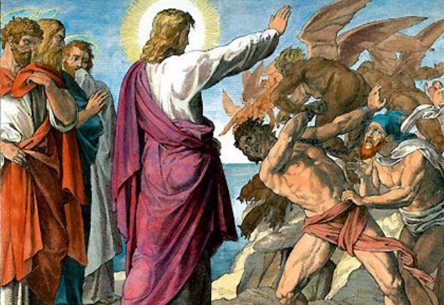 Dois possessos de demônios saíram de um cemitério e vieram-lhe ao encontro. Eram tão furiosos que pessoa alguma ousava passar por ali. Eis que se puseram a gritar: "Que tens a ver conosco, Filho de Deus? Vieste aqui para nos atormentar antes do tempo?”. Havia, não longe dali, uma grande manada de porcos que pastava. Os demônios imploraram a Jesus: "Se nos expulsas, envia-nos para aquela manada de porcos”. – "Ide” – disse-lhes. Eles saíram e entraram nos porcos. Nesse instante, toda a manada se precipitou pelo declive escarpado para o lago, e morreu nas águas. Os guardas fugiram e foram contar na cidade o que se tinha passado e o sucedido com os endemoninhados. [...]