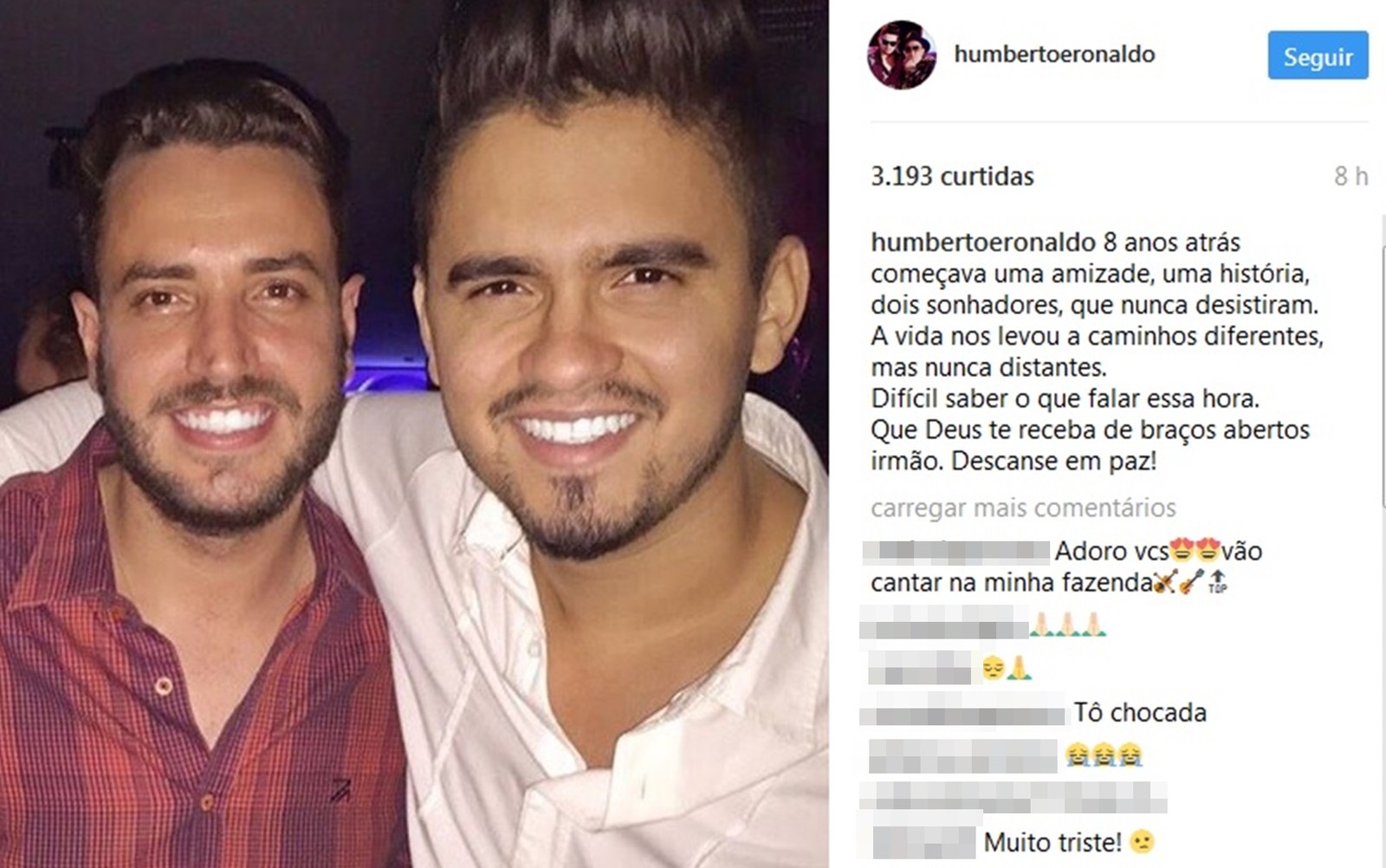 Já o cantor Humberto, da dupla com Ronaldo, colocou uma foto junto dele junto com o empresário. Ele contou que já conhecia Didi há quase dez anos e lamentou a morte. "Oito anos atrás começava uma amizade, uma história, dois sonhadores, que nunca desistiram. A vida nos levou a caminhos diferentes, mas nunca distantes. Difícil saber o que falar essa hora. Que Deus te receba de braços abertos irmão. Descanse em paz!".