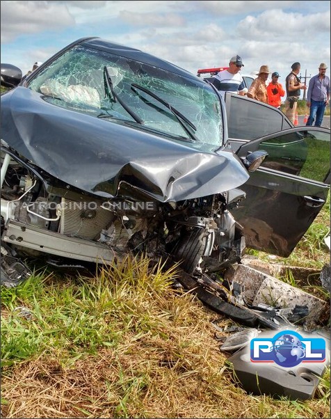 Com o impacto, o veículo Corolla sofreu danos em toda a frente. A Perícia Técnica esteve no local colhendo imagens e informações para laudo pericial.