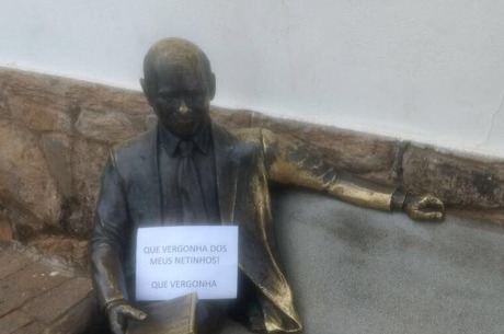 A estátua de Tancredo Neves, em São João del-Rei (MG), ganhou uma placa depois do escândalo político que atingiu o Brasil nos últimos dias. A escultura que fica no centro da cidade em que o ex-presidente da República nasceu e em frente ao memorial que leva o seu nome está com um papel branco com os dizeres: "Que vergonha dos meus netinhos! Que vergonha".