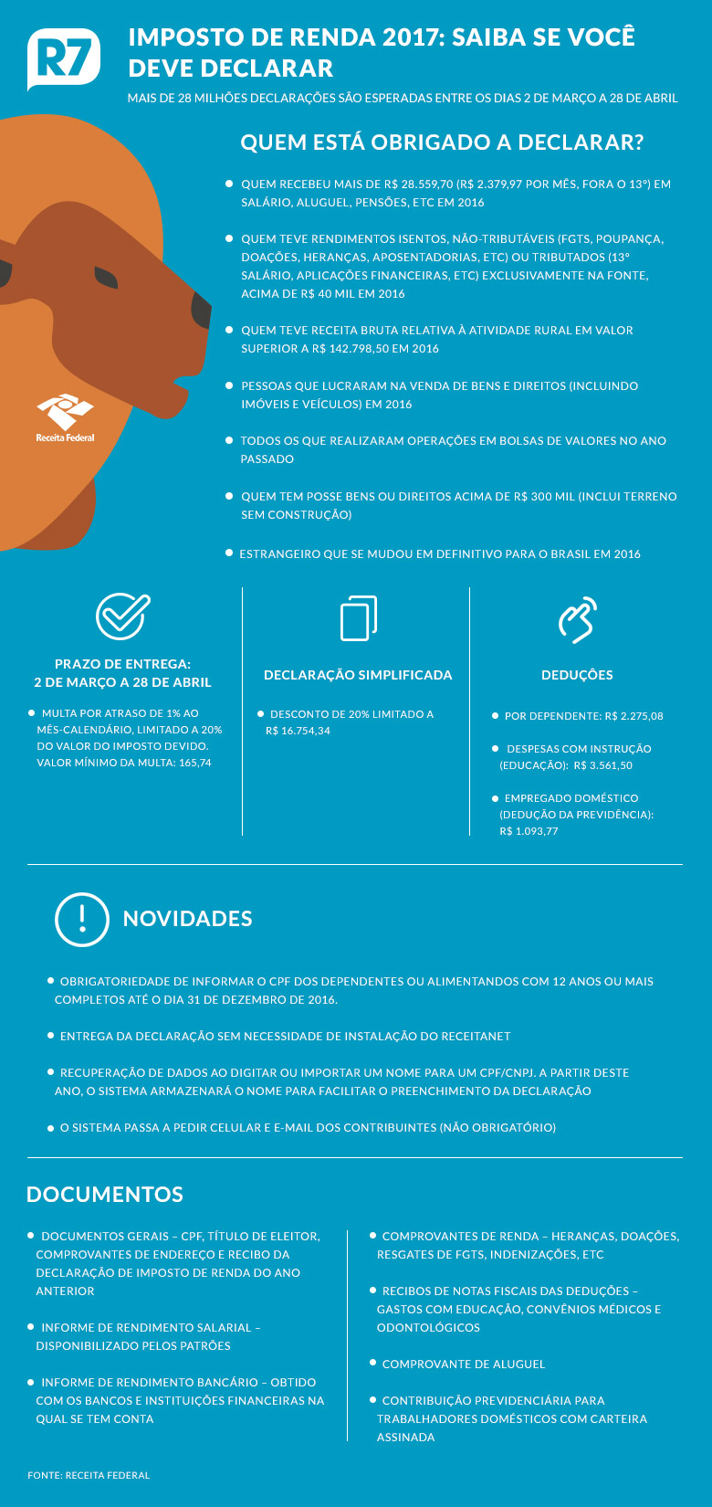 Neste ano, estão obrigados a enviar a declaração todos aqueles que receberam mais de R$ 28.599,70 ou tiveram rendimentos isentos acima de R$ 40 mil no ano passado. Também devem direcionar o documento para a Receita Federal quem tem posses (casas, carros, terrenos, etc) com valor superior a R$ 300 mil.