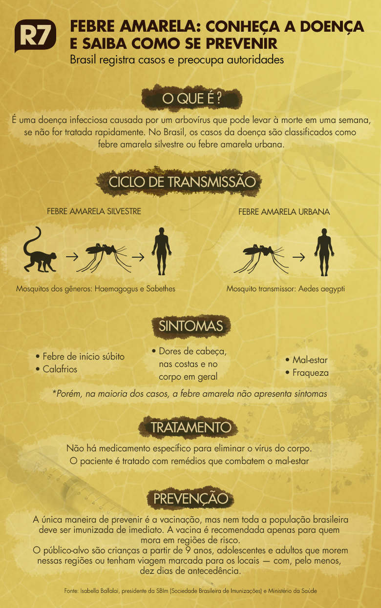 A vacinação de rotina contra a febre amarela é oferecida em 19 estados do país com recomendação para imunização para a doença. Todas as pessoas que vivem nesses locais devem tomar duas doses da vacina ao longo da vida. Também precisam se vacinar, neste momento, pessoas que vão viajar ou vivem nas regiões que estão registrando casos da doença: leste de Minas Gerais, oeste do Espírito Santo, noroeste do Rio de Janeiro e oeste da Bahia.