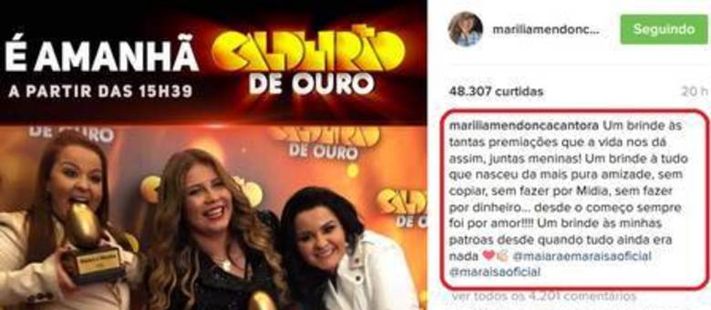 Na mensagem original, que causou a confusão, Marília dizia: "Um brinde às tantas premiações que a vida nos dá assim, juntas, meninas! Um brinde a tudo que nasceu da mais pura amizade, sem copiar, sem fazer mídia, sem fazer por dinheiro... Desde o começo, sempre foi por amor! Um brinde às verdadeiras patroas desde quando tudo ainda era nada, Maiara e Maraisa".