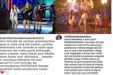 Foi o que bastou para que os internautas vissem na mensagem uma crítica para a dupla Simone e Silmara, que acaba de lançar o clipe da música "Loka" com Anitta. Marília começou a ser atacada nas redes sociais e acabou editando trechos do post original, além de compartilhar outro, com explicações.
