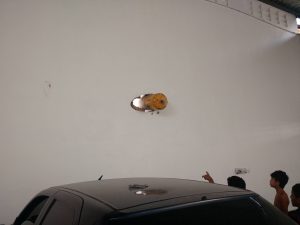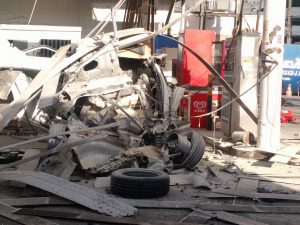 O cilindro de gás saiu voando atingindo e destruíndo veículo até perfura uma parede como um projétil, onde ficou afixado.