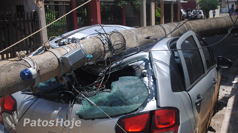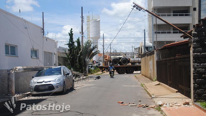 O acidente aconteceu no início da tarde desta quarta-feira (07) no Bairro Cônego Getúlio, em Patos de Minas. O guincho transportava o cavalo mecânico de uma carreta quando o veículo arrastou a fiação. O poste não resistiu e veio abaixo. Um carro que estava devidamente estacionado foi atingido em cheio. O padrão de uma casa também foi danificado.