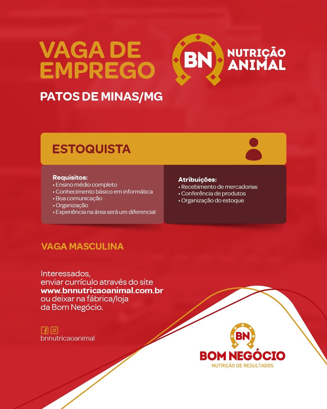 Enviar currículo através do site www.bnnutricaoanimal.com.br ou por e-mail para [email protected]. Também é possível entregar pessoalmente na fábrica ou na loja da Bom Negócio.