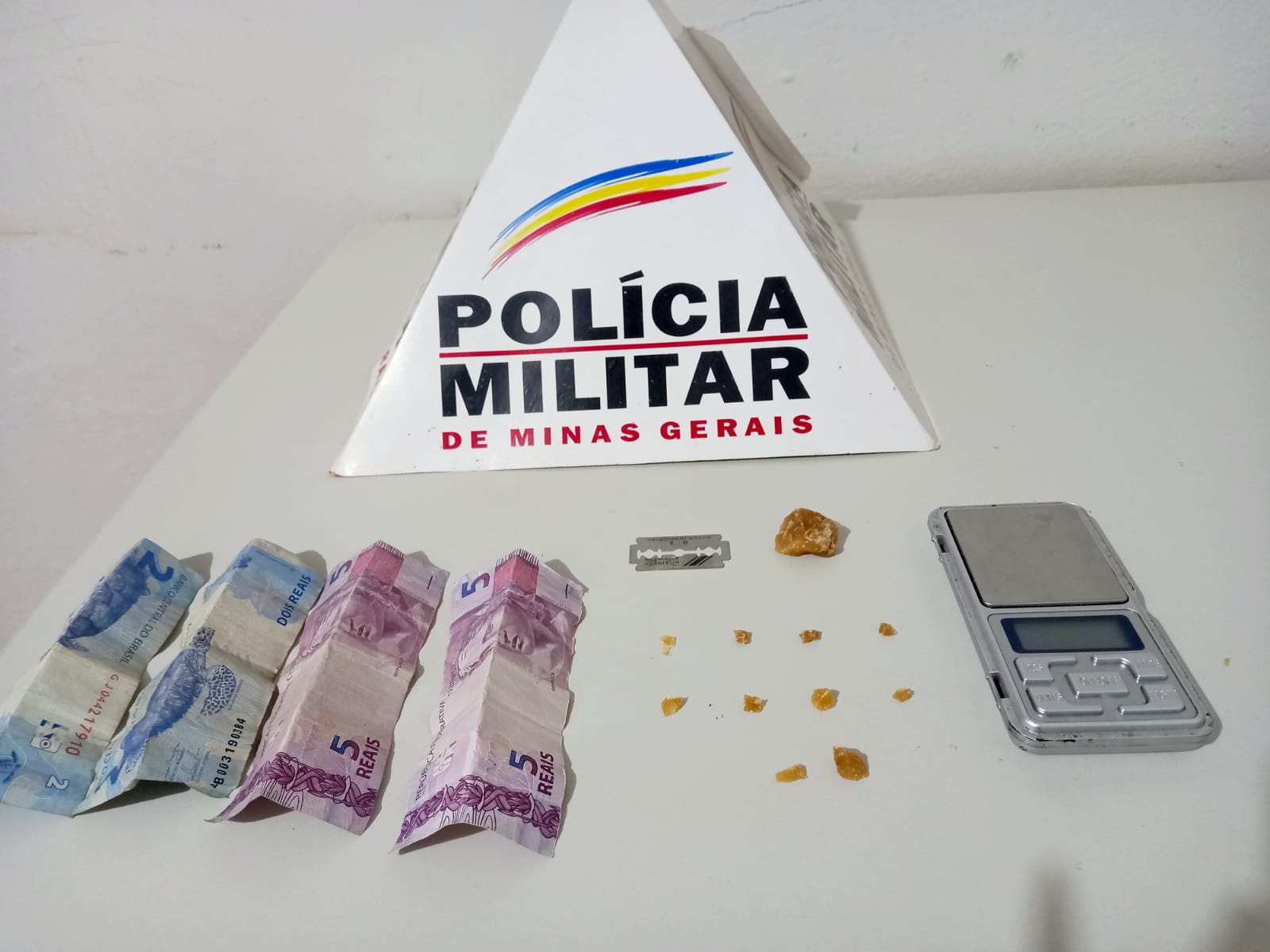 Na residência dele foram localizadas 10 pedras de crack (prontas para o comércio), 01 Pedra bruta (Fracionada renderia 30 pedras de crack aproximadamente), balança de precisão e R$ 14,00 reais.