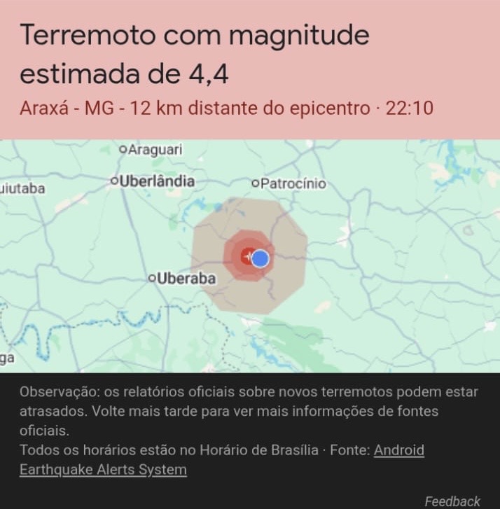 A Defesa Civil e a Prefeitura de Araxá confirmaram a ocorrência de um terremoto de magnitude 4.4 na noite de sexta-feira 12/12. O tremor de terra foi registrado por volta das 22h10 e pôde ser sentido em diferentes pontos da cidade e da região. LEIA AQUI