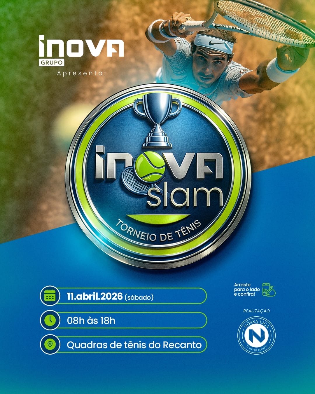 O município de Patrocínio recebe, neste sábado (11), o Inova Slam de Tênis, evento que promete movimentar a cena esportiva regional. A competição tem início às 7h, nas quadras de saibro do Recanto Academy, reunindo tenistas de diferentes níveis técnicos em uma programação que se estende por todo o dia.