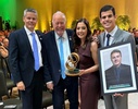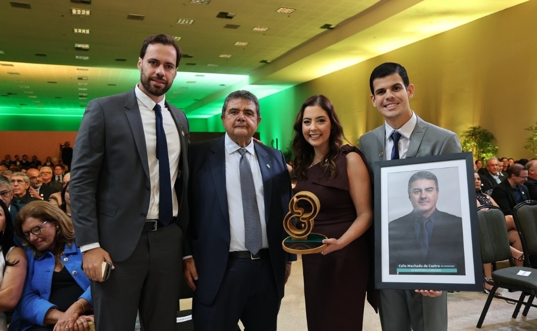 Viviane Rodrigues e Otávio Alves subiram ao palco levando um quadro com a foto do saudoso Celio Machado de Castro, reforçando a relevância de seu trabalho no período em que presidiu a Coopacredi e o impacto que teve para a entidade chegar a patamares tão elevados no segmento cooperativista.