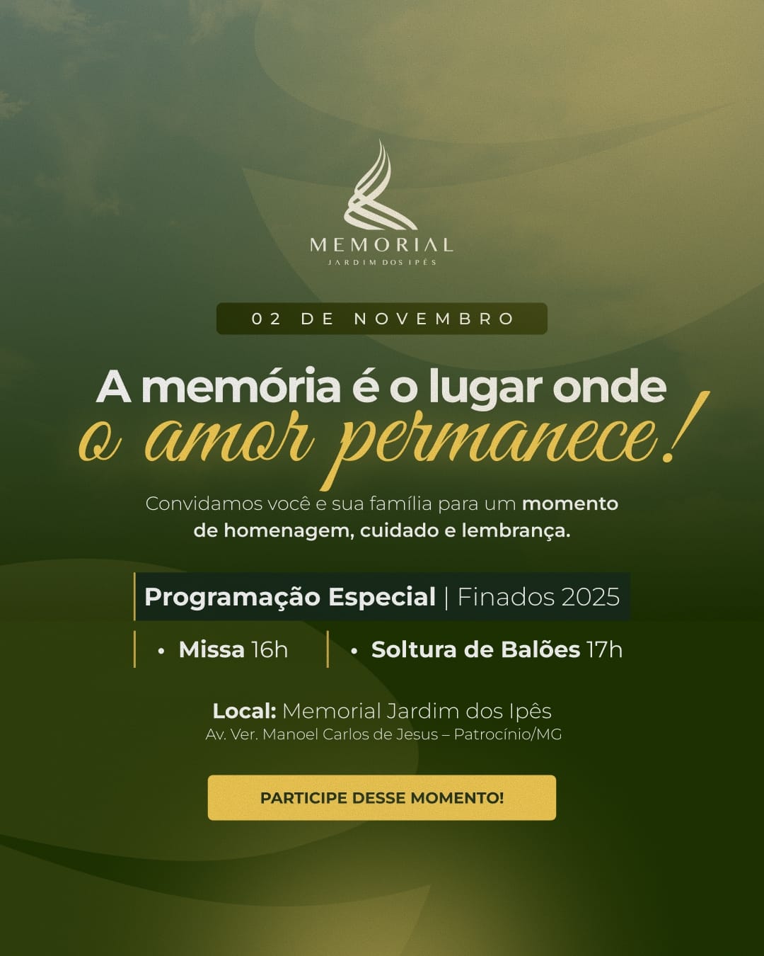 Será sepultado neste sábado, 1º de novembro de 2025, às 10h00min, no Cemitério Municipal de Patrocínio/MG.
