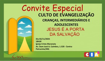 A Igreja Cristã Maranata realizará neste domingo, dia 02 de novembro, um culto especial voltado para crianças e adolescentes, com o tema “JESUS É A PORTA DA SALVAÇÃO”. O evento é aberto a toda a comunidade patrocinense e tem entrada franca.