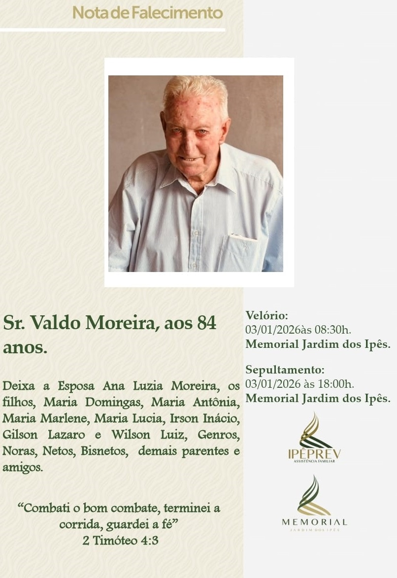 Faleceu nesta sexta-feira, 03 de janeiro de 2026, em Patrocínio/MG, o Sr. Valdo Moreira aos 84 anos.