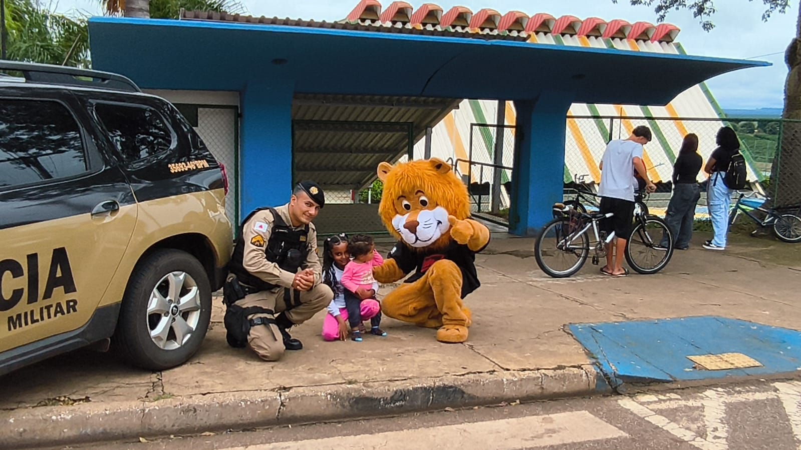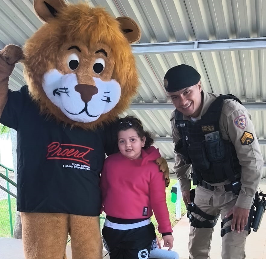 A atividade em Patrocínio teve um momento especial com a participação do mascote do PROERD, o leão Daren, que levou alegria às crianças e tornou o retorno às aulas mais acolhedor e marcante.