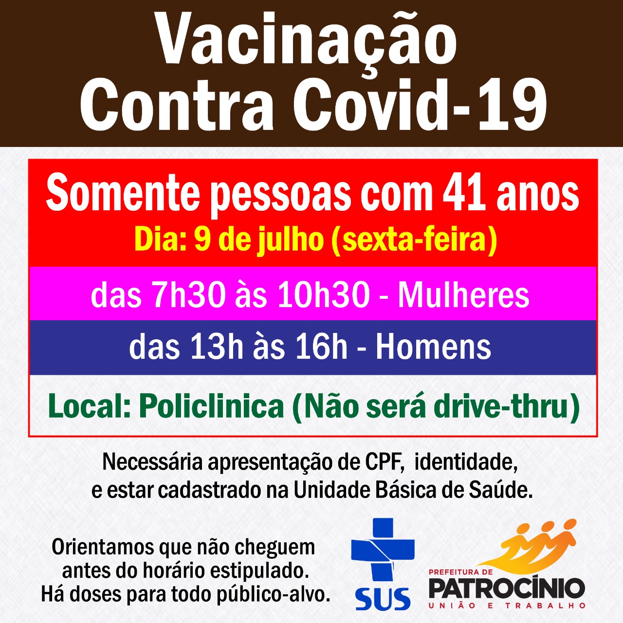 A SMS orienta também que as pessoas não cheguem muito antes do horário estipulado para evitar espera desnecessária e cansaço, pois há vacina suficiente para todos dessa faixa etária.