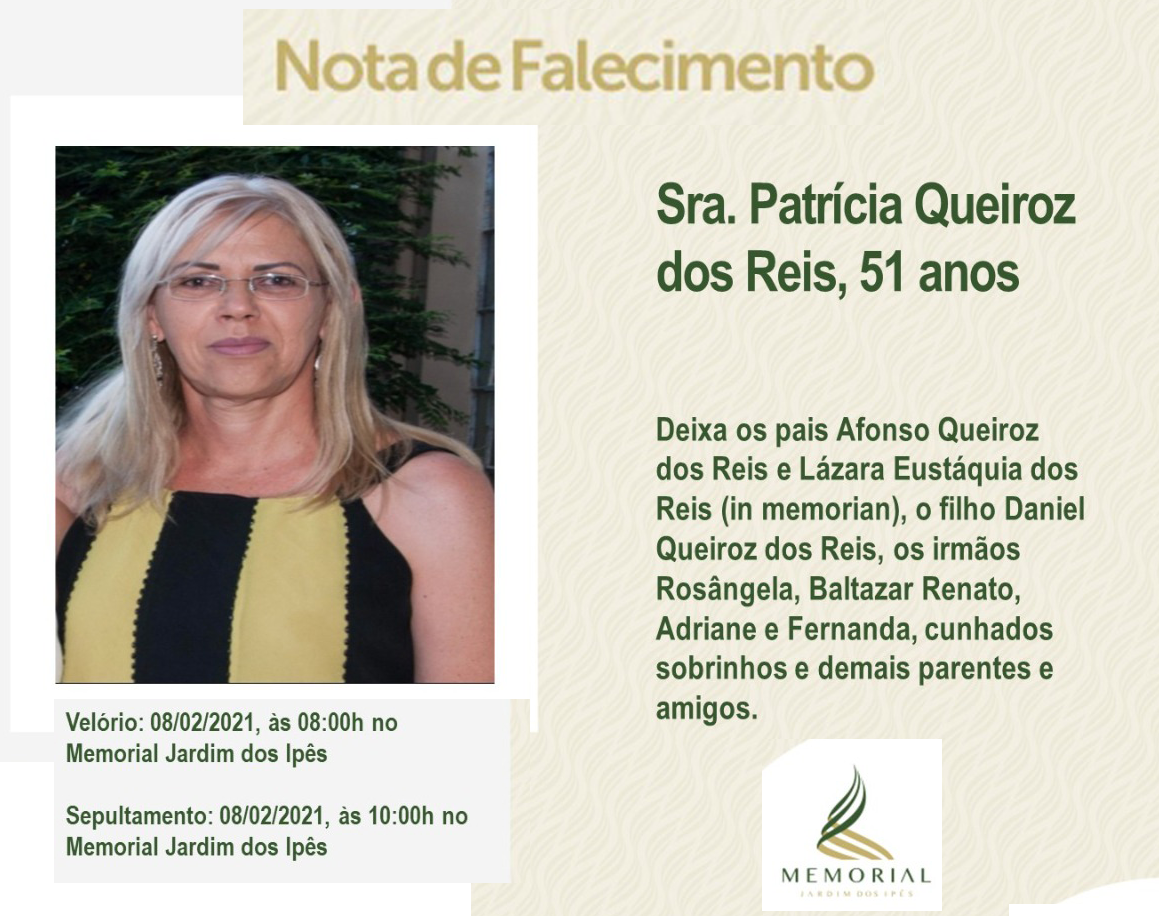 (Cerimônia fúnebre restrita a familiares conforme decreto municipal nº 3.779) na Funerária São Pedro e Velório Príncipe da Paz Avenida Altino Guimaraes, 1056 Centro Sala 03 Patrocínio- MG dia 21/08/2021 a partir das 07:00 horas e será sepultada às 09:00 horas no Cemitério Memorial Jardim dos Ipês Patrocínio-MG.